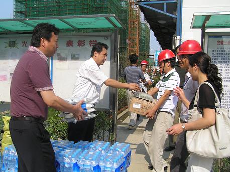 7月26日下午,安徽建工集團工會副主席李鵬飛一行在省三建副總經理駱新農的陪同下,來到該公司高速·濱湖時代廣場二期項目部和亞華名苑二期項目部“送清涼”。將綠豆、白糖、礦泉水等防暑降溫食品送到工地,受到了職工歡迎。