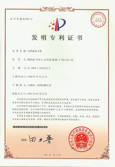 2010年7月21日,國家知識產權局授予安徽建工集團“幕墻旋轉支架”發明專利權,并頒發了“發明專利證書”。