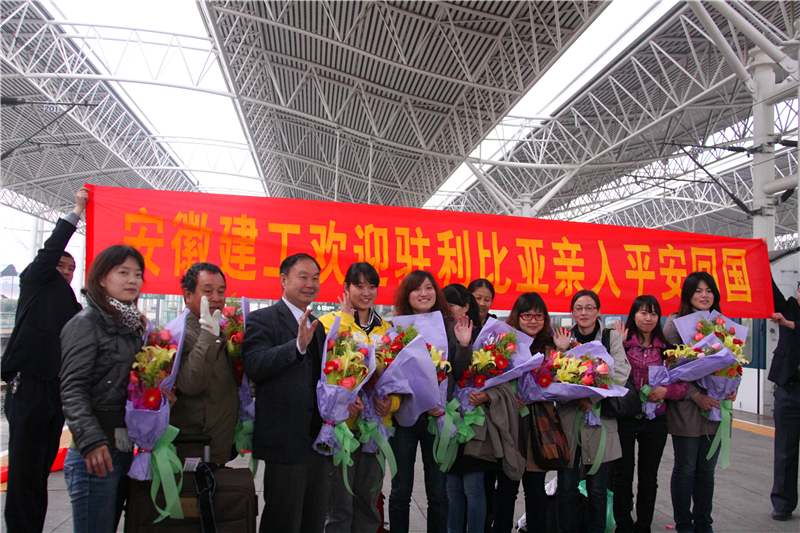 早上7點,春寒料峭。省政府、省國資委、省商務廳、省外辦等有關領導,安徽建工集團董事長胡運成及有關單位負責同志就早早抵達了火車站等候。7時40分,隨著從北京駛來的Z73次火車平穩停站,等候人員拉起了“熱烈歡迎我省外派利比亞人員第一批親人平安返回家鄉”、“安徽建工歡迎駐利比亞親人平安回國”等醒目的橫幅,手捧鮮花列隊歡迎從利比亞回國的人員。