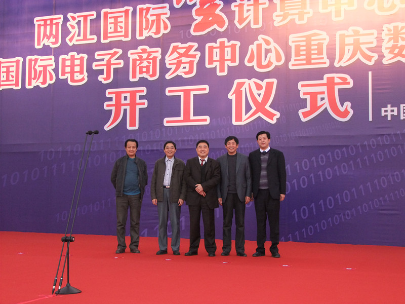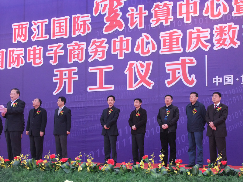 在4月6日的兩江新區兩江國際云計算中心奠基啟動儀式上,重慶市市長黃奇帆為兩江國際云計算中心授牌、市領導翁杰明、童小平參加開工儀式。集團公司董事長胡運成出席開工儀式并為重慶兩江新區兩江國際云計算中心暨中國國際電子商務中心重慶數據產業園奠基。隨同胡運成董事長參加儀式的有集團公司副總經理王元曦、二建公司總經理費瑞林、國內公司總經理陳傳文等。