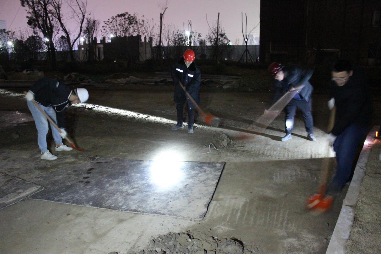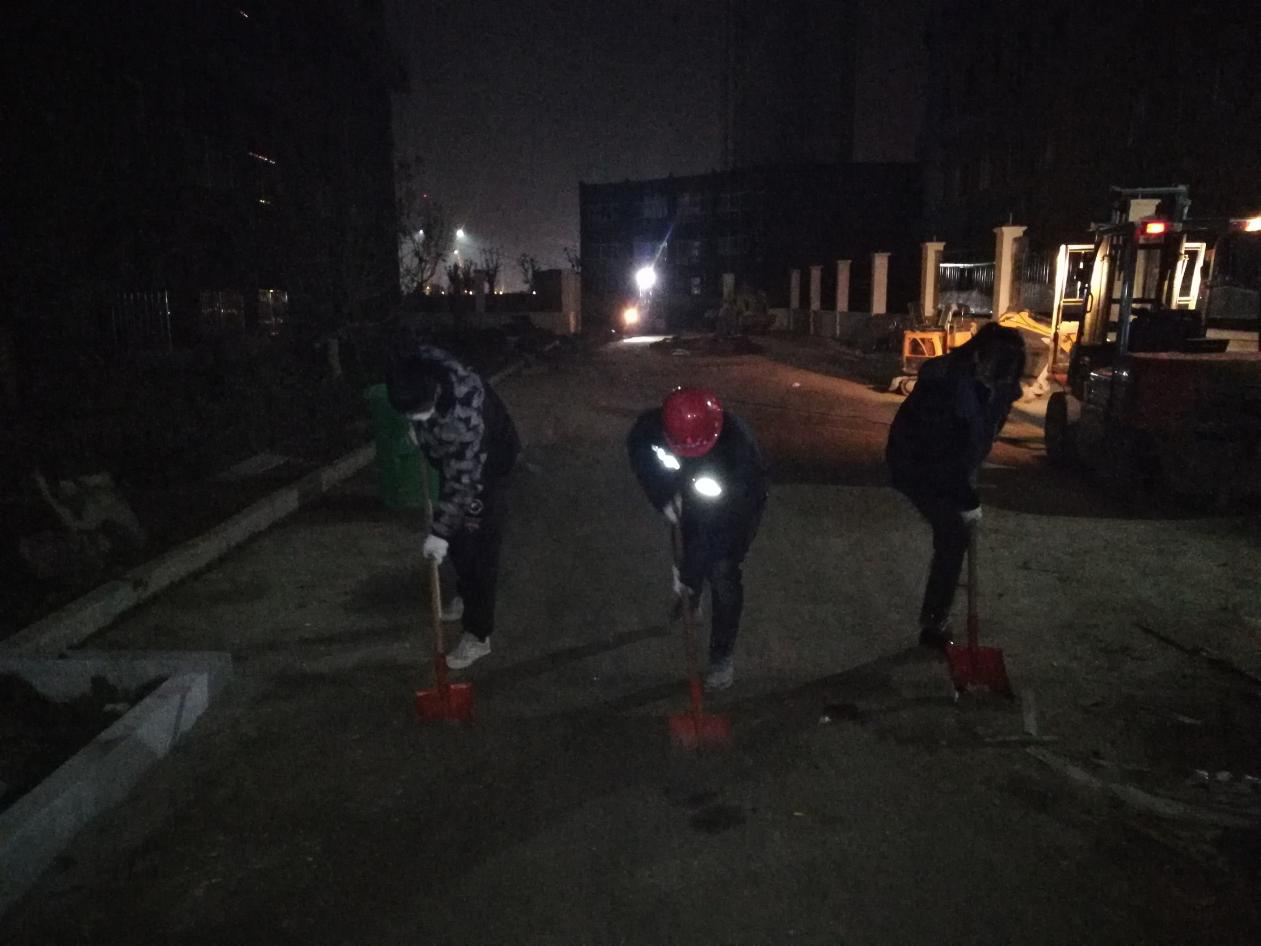 由于受到18年年末第一場(chǎng)雪的“洗禮”,積雪融化,導(dǎo)致項(xiàng)目內(nèi)的淤泥隨處可見(jiàn),影響后期的施工進(jìn)度。為了實(shí)現(xiàn)白天夜晚交叉作業(yè),晚上六點(diǎn),阜陽(yáng)公司黨支部書(shū)記、總經(jīng)理周鑫帶領(lǐng)全體黨員深入到泥土最多,工作難度較大的區(qū)域開(kāi)展路面大清潔,并要求黨員亮明身份,積極發(fā)揮好先鋒模范作用。