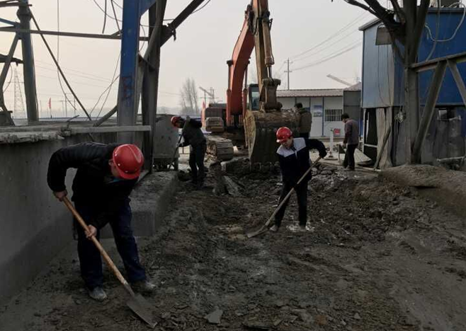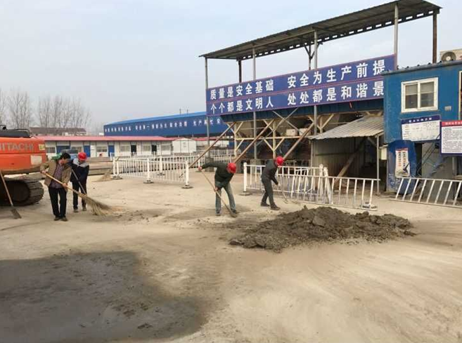 在后場的場站大門、分區(qū)隔離帶、拌合站等處,突擊隊員們有的掃、有的鏟、有的運、有的推,個個干勁使足,有條不紊地對各處的塵土、淤泥、結(jié)塊混凝土進行清理。