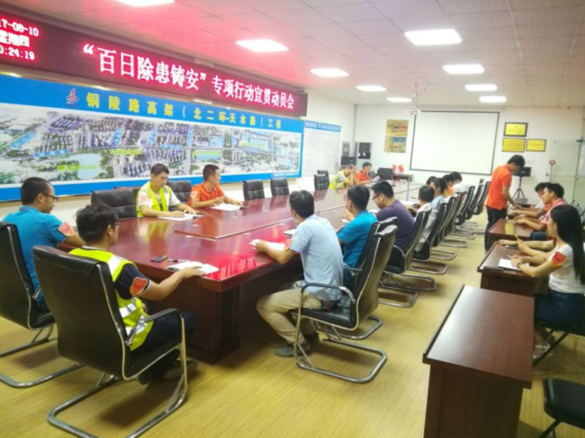 8月10日晚,安徽路港銅陵路高架項(xiàng)目部組織召開“百日除患鑄安”動(dòng)員大會(huì),項(xiàng)目部全體職工、“青安崗”成員及班組長(zhǎng)約30人參加,項(xiàng)目部安全部長(zhǎng)曹志強(qiáng)主持會(huì)議。