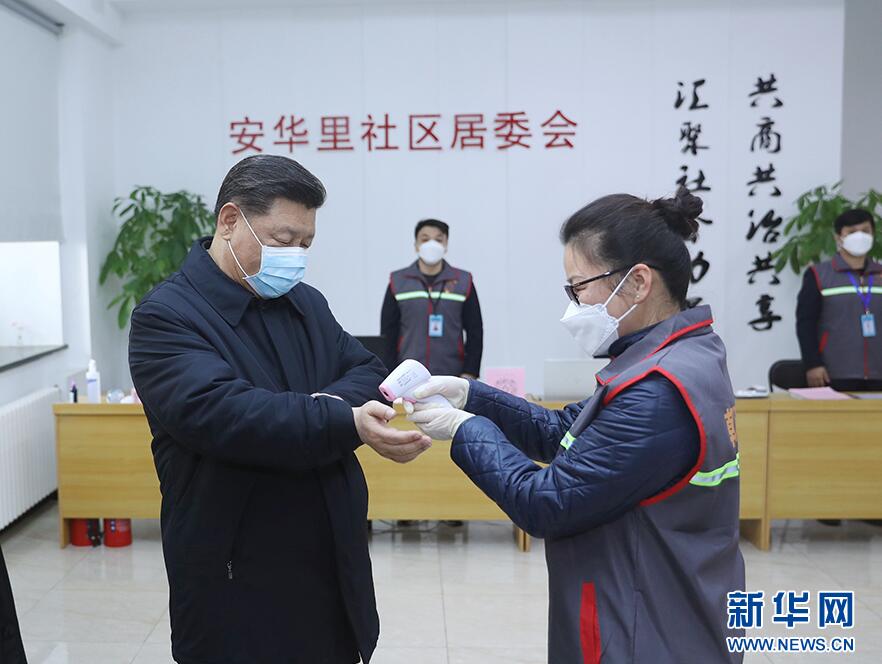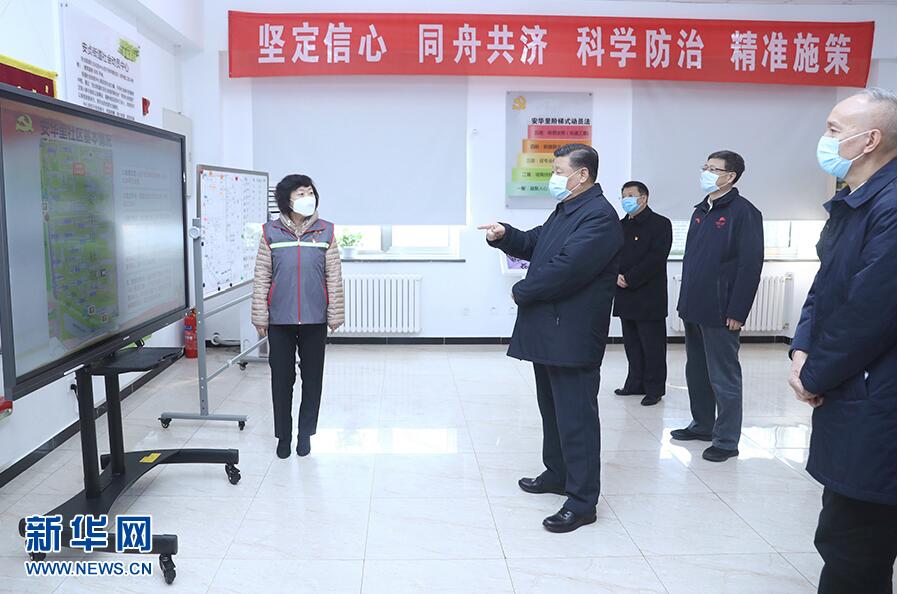 習近平首先來到北京市朝陽區安貞街道安華里社區,了解基層一線疫情聯防聯控情況。在社區居民委員會疫情防控指揮部,習近平聽取了安貞街道和安華里社區開展聯防聯控情況介紹。習近平對社區采取多項措施,落實防控責任,實現入戶排查、重點群體監控“兩個全覆蓋”等做法表示肯定。他強調,社區是疫情聯防聯控的第一線,也是外防輸入、內防擴散最有效的防線。把社區這道防線守住,就能有效切斷疫情擴散蔓延的渠道。全國都要充分發揮社區在疫情防控中的阻擊作用,把防控力量向社區下沉,加強社區各項防控措施的落實,使所有社區成為疫情防控的堅強堡壘。要以疫情防控工作成效來檢驗和拓展“不忘初心、牢記使命”主題教育成果,發揮基層黨組織政治引領作用和黨員先鋒模范作用,把社區居民發動起來,構筑起疫情防控的人民防線。