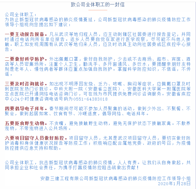疫情牽動億萬人心。黨中央、國務院高度重視疫情防治工作,習近平總書記作出重要指示,強調要把人民群眾生命安全和身體健康放在第一位,堅決遏制疫情蔓延勢頭。安徽三建公司黨委迅速行動,積極貫徹落實黨中央、國務院和省委、省政府、省國資委和集團公司關于新型冠狀病毒肺炎疫情防控工作部署要求,在春節前重點部署武漢項目人員疫情防控工作的基礎上,1月27日發出緊急通知,全面落實公司防控工作。