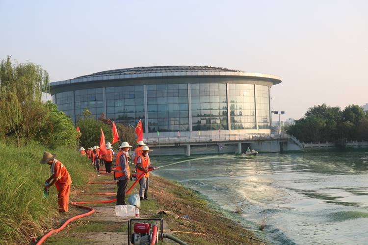當天,一大早,70多名黨員、職工就感到巢湖環(huán)湖北路塘西河大橋邊,現(xiàn)場成立了三支黨員突擊隊,大家頭頂烈日,冒著37攝氏度的高溫,投入到治理藍藻攻堅戰(zhàn)中。大家沿湖開展集中作業(yè),連續(xù)抽取湖水投放殺藻劑或絮凝劑,再排放回湖中。一整天工作中, 在藍藻治理活動中,廣大黨員、團員勇當先鋒,連續(xù)工作12小時。 大家的工作服干了又濕,濕了又干。十二公司青年黨員曾祥軍同志說:“八百里巢湖是合肥的名片,是合肥市寶貴的自然資源,能夠參與到巢湖藍藻治理中,做保衛(wèi)環(huán)境的戰(zhàn)士,義不容辭”。