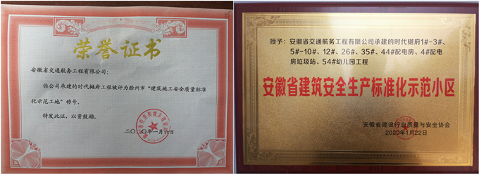 滁州時代樾府項目始終貫徹“精益求精、精細管理、精雕細刻、打造精品”的管理理念,采用策劃現行、制定措施、穩步推進、過程控制、嚴格把關、明確責任、獎罰到位的方法和原則。重視現場安全文明施工,堅持綠色施工,以人為本的管理理念,把工作作為現場控制的核心之一。施工過程中重視危險源的分析識別與防控,嚴格落實國家和業主及建立的各項管理規章制度。項目先后被評為“安徽省建筑安全生產標準化示范小區”“滁州市建筑施工安全質量標準化示范工地”“滁州市建設工程施工質量標準化示范工程”,并被中新蘇滁產業園評為“2019年度建筑工程優秀企業”、被北京城房評為“2019年度優秀合作商”等榮譽稱號。