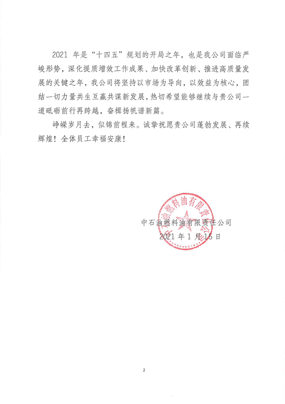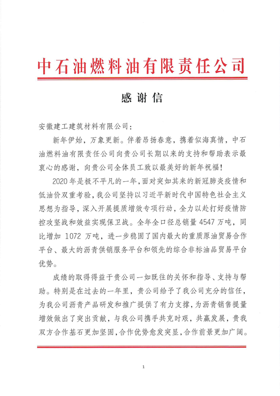 此次中石油燃料油公司給安建建材送來感謝信,標志著雙方合作邁向了一個新的臺階。隨著雙方的合作升級,相信在未來能夠繼續深入探討共贏新模式,開辟合作新征程。