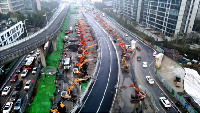 2月3日7時(shí),由安徽省公路橋梁工程有限公司承建的合肥市金寨路高架南向西至南二環(huán)左轉(zhuǎn)匝道開始進(jìn)行拆除作業(yè)。30臺(tái)大型破碎機(jī)分布于匝道橋兩側(cè)同時(shí)進(jìn)行破碎,8臺(tái)霧炮機(jī)、7臺(tái)灑水車對(duì)施工區(qū)域持續(xù)噴灑降塵。僅用15個(gè)小時(shí)便完成了原計(jì)劃兩天的匝道拆除任務(wù),標(biāo)志著暢通二環(huán)(西南環(huán))一標(biāo)段在全線率先進(jìn)入二階段施工作業(yè),為后續(xù)主體施工奠定了堅(jiān)實(shí)基礎(chǔ)。