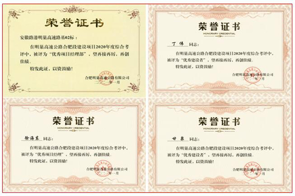 業(yè)主的好評(píng)是對(duì)我們最大的認(rèn)可:明巢路基02標(biāo)在明巢高速公路合肥段項(xiàng)目公司2020年度項(xiàng)目綜合考評(píng)比分中排名第一,榮獲“優(yōu)秀項(xiàng)目經(jīng)理部”榮譽(yù)稱號(hào),項(xiàng)目部5人榮獲2020年度“優(yōu)秀建設(shè)者”榮譽(yù)稱號(hào)。