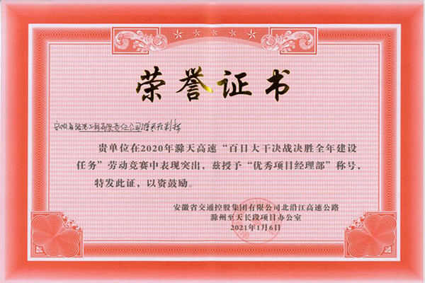滁天高速02標(biāo)、滁天高速預(yù)制標(biāo)項(xiàng)目部榮獲安徽交控集團(tuán)百日大干勞動(dòng)競(jìng)賽“優(yōu)秀項(xiàng)目經(jīng)理部”稱號(hào)。