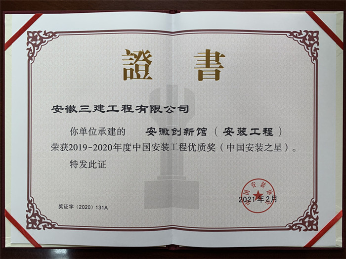 4月22日,中國安裝協會第七屆二次理事(擴大)會議暨工程創優經驗交流會在濟南召開。會議對2019-2020年度中國安裝工程優質獎(中國安裝之星)獲獎單位進行表彰并頒發獎杯和榮譽證書;安徽三建合肥市二院新區內科病房大樓項目及安徽創新館項目(安裝工程)獲此殊榮。該獎項獲得充分說明了安徽三建安裝施工水平。