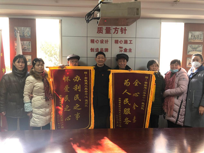 為安徽省機械施工公司龍崗集資樓24戶辦理了12年來未辦成的房產證問題,接到房產證之際,住戶們特地送來兩面錦旗—“辦利民之事,懷愛民之心”、“全心全意為人民服務”,表達了對黨總支書記、總經理施愛民為他們辦實事的感激之情。