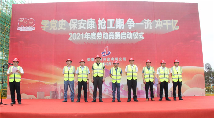 6月16日上午,安徽水利2021年“學黨史、保安康、搶工期、爭一流、沖千億”勞動競賽啟動儀式,在安徽水利城建公司上海(蚌埠)微電子科技園項目施工現場舉行。安徽水利黨委書記、董事長張曉林出席啟動儀式,并宣布勞動競賽正式啟動。