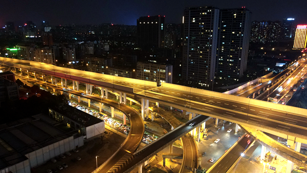 進入9月,位于皖南山區的安徽路橋道路分公司宣涇高速涇縣樞紐互通項目施工現場,呈現出白天一片熱火朝天、夜晚依然燈火通明的大干景象。遠遠望去,只見立體式的互通環環相扣,一排排高低整齊的滿堂支架沿著山谷向四方輻射,在青山映襯之下,頗為壯觀。