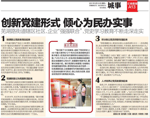 自黨史學習教育開展以來,安建建材黨委及所屬各支部通過方式方法創新,推動黨史學習教育深入群眾、深入基層、深入人心。拍攝“不忘初心”MV;利用黨員學習平臺組織黨史專題線上答題活;通過QQ工作群發布“黨史學習·每日一題”;制作黨史重大歷史事件展板,線上線下構建起全方位、多角度的網絡媒介學習平臺,不僅營造了濃厚的黨史學習氛圍,使黨史學習走深走實,入腦入心,更受到了江淮晨報、學習強國合肥學習平臺等主流媒體關注報道。