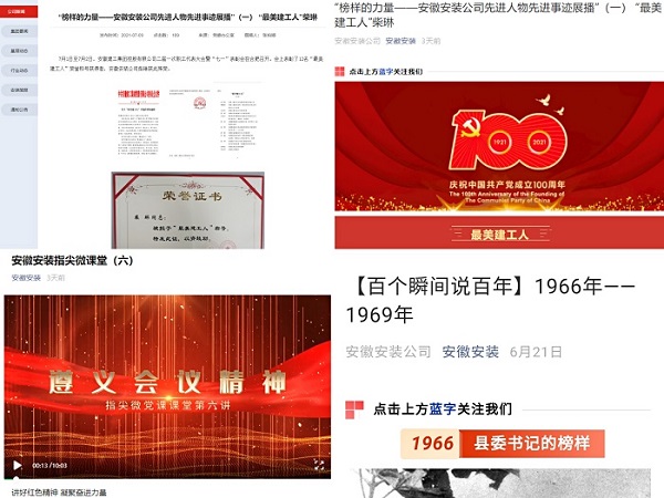公司黨委第一時間編印專刊、宣傳板報下發至所屬各單位和基層項目一線,用好企業網站、微信公眾號、電子屏、宣傳欄和所屬各單位、各項目部所有宣傳陣地,在公司網站、微信公眾號先后開設“百個瞬間說百年”“黨史學習教育專欄系列報道”“榜樣的力量——安徽安裝公司先進人物先進事跡展播”“記錄奮進力量—安徽安裝公司基層一線事跡展播”等專欄進行專題宣傳,大力營造“學習黨史有熱情,干事創業有激情”的良好氛圍,合肥分公司黨支部舉辦黨史學習教育主題攝影大賽,努力營造悟初心、守初心、踐初心的強大聲勢。