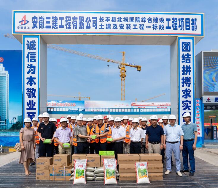 7月24日上午,建工控股總法律顧問申玉恩冒著高溫酷暑,來到安徽三建長豐縣北城醫院項目慰問奮戰在施工一線的干部職工,為他們送去了防暑降溫用品,并深入一線,實地察看了施工現場??毓煞墒聞詹坎块L王勇、信訪保衛部部長駱新農,三建公司黨委書記、董事長左登宏、紀委書記、工會主席李家保等陪同慰問。