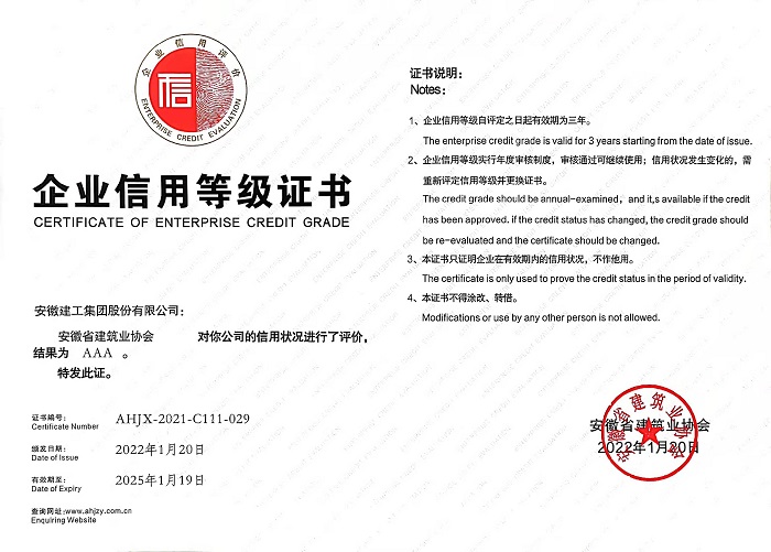 安徽建工集團作為省屬大型國有上市企業,秉承“創造空間藝術,成就人文生活”的企業使命,堅守“誠信為本、敬業至上”的企業核心價值觀,恪守“重合同、守信譽”和“質量第一、用戶至上”服務宗旨,強化信用體系建設,加強項目履約管理,樹立良好品牌形象。此次獲評AAA級信用企業,是繼中國建筑業協會“建筑業AAA級信用企業” “中企聯2020年第一批AAA級信用企業”“中國承包商80強”“納稅信用A級納稅人”后的誠信體系建設又一新成果。