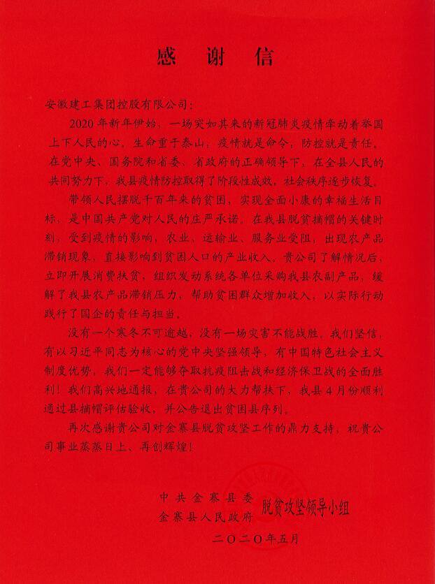 近日,集團(tuán)收到中共金寨縣委、金寨縣人民政府脫貧攻堅(jiān)領(lǐng)導(dǎo)小組的感謝信,對(duì)集團(tuán)在疫情期間大力開展消費(fèi)扶貧,幫助金寨縣解決農(nóng)副產(chǎn)品滯銷問(wèn)題的義舉給予了高度評(píng)價(jià)和衷心感謝。