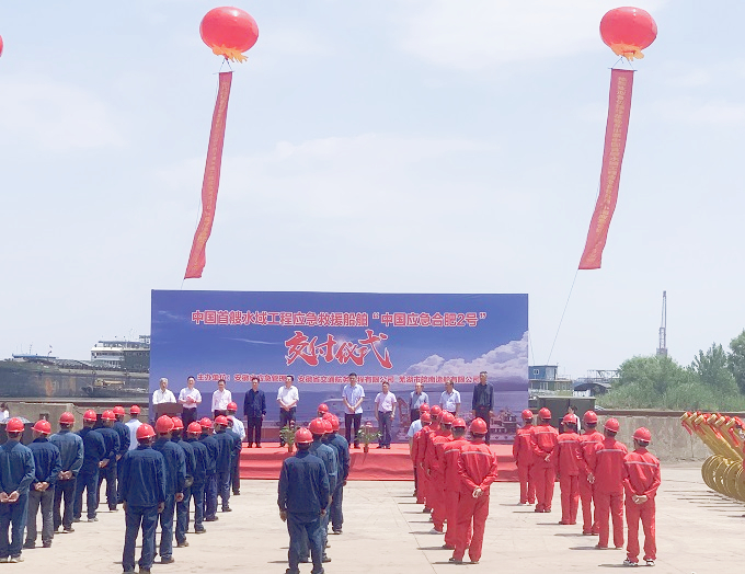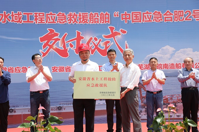 5月23日上午11時18分,伴隨著船舶隆隆的汽笛聲,在隆重的交付儀式中,中國首艘水域工程應急救援船舶“中國應急合肥2號”正式入列安徽交航應急救援基地。安徽省應急管理廳一級巡視員汪黎明,控股公司副總工程師、股份公司首席信息官吳紅星出席儀式。應急管理廳救援協調和預案管理處處長魏文斌、三級調研員沈磊,蕪湖市應急管理局副局長程克柱,安徽省皖江船舶檢驗局副局長孫成嶺、王其端,蕪湖市皖南造船有限公司副總經理陸青松等參加上述儀式。公司黨委書記、董事長方申柱主持儀式。