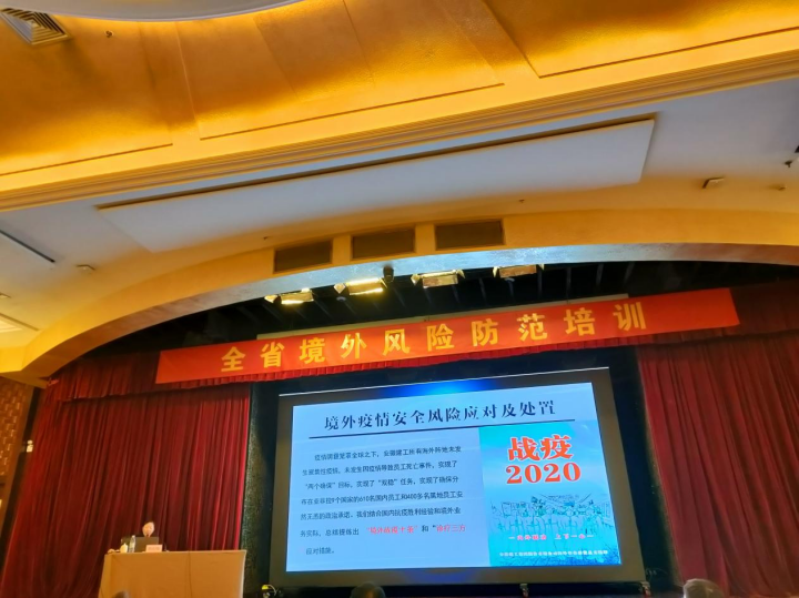 7月15日下午,安徽建工集團(tuán)股份公司副總經(jīng)理,海外事業(yè)部黨總支書記、總經(jīng)理邢應(yīng)梅應(yīng)邀參加全省境外風(fēng)險防范培訓(xùn)班并作《企業(yè)境外安全風(fēng)險防范》專題授課。該培訓(xùn)由安徽省商務(wù)廳主辦,安徽省各地市商務(wù)主管部門負(fù)責(zé)人和省內(nèi)外經(jīng)外貿(mào)企業(yè)負(fù)責(zé)人近200人參加培訓(xùn)。
