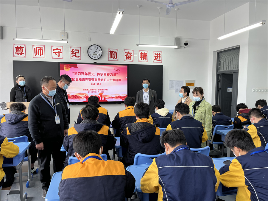 為深入宣傳貫徹黨的二十大精神,慶祝中國(guó)共青團(tuán)成立一百周年,學(xué)習(xí)習(xí)近平新時(shí)代中國(guó)特色社會(huì)主義思想及關(guān)于青年工作的重要思想,推動(dòng)廣大學(xué)生對(duì)黨團(tuán)史知識(shí)的進(jìn)一步學(xué)習(xí),真正達(dá)到以賽促學(xué),以學(xué)促用目的,安徽建工技師學(xué)院團(tuán)委舉辦了“學(xué)習(xí)百年團(tuán)史,傳承青春力量”黨團(tuán)史知識(shí)競(jìng)賽暨宣貫黨的二十大精神活動(dòng)。學(xué)院黨委委員、副院長(zhǎng)任建設(shè)親臨競(jìng)賽現(xiàn)場(chǎng)指導(dǎo),院長(zhǎng)助理曹新彩、德育工作部主任楊繼強(qiáng)、紀(jì)委副書記王海及相關(guān)部門負(fù)責(zé)人觀摩了競(jìng)賽。