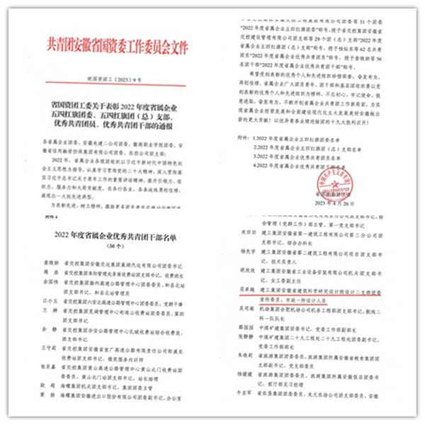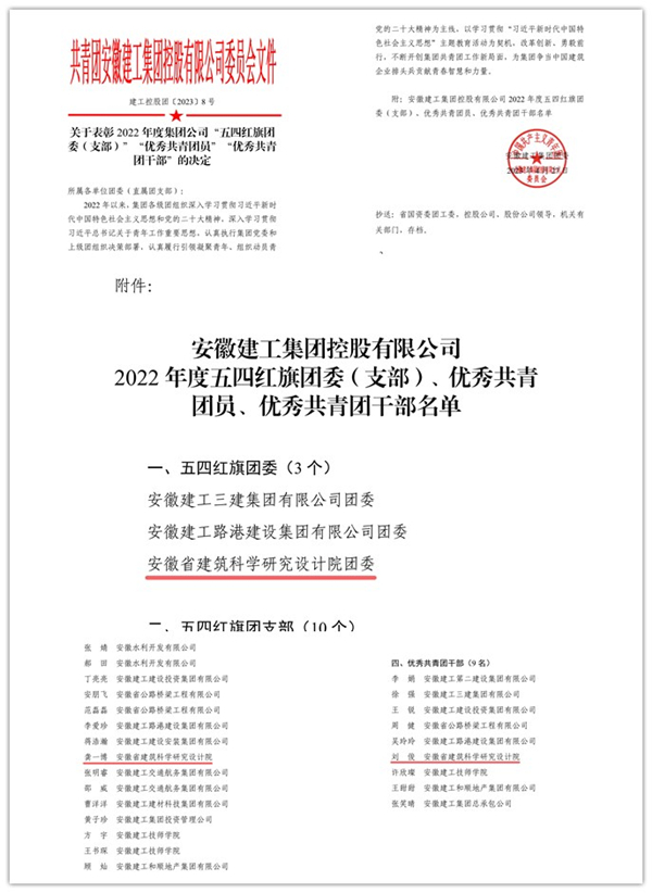 近日,省國資委團工委、建工集團團委相繼公布了2022年度省屬企業和安徽建工集團控股有限公司五四紅旗團委(團支部)、五四紅旗團(總)支部、優秀共青團員、優秀共青團干部名單,安徽省建科院1個集體、3名個人受表彰。