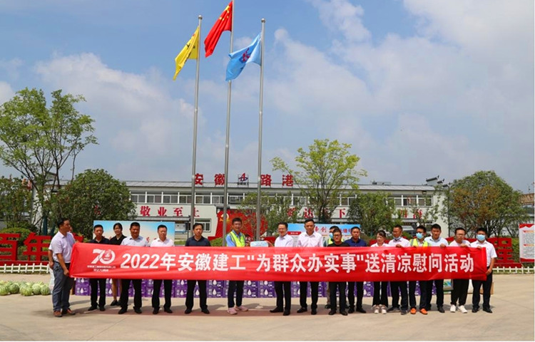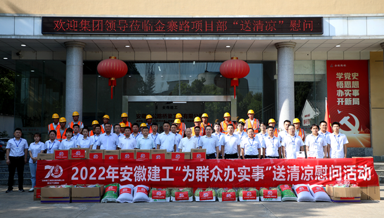 在安徽路橋金寨路項目,集團黨委書記、董事長趙時運將慰問品送到一線職工手中,并和大家親切交談,細致了解大家的生活工作情況,叮囑要注意勞逸結合,做好防暑降溫工作。慰問中,他要求,要深入貫徹落實習近平總書記關于安全生產的重要指示精神,嚴格落實高溫天氣作業時間要求,進一步壓實“五落實五到位”安全生產主體責任,加強對防暑降溫等工作的組織領導、措施落實,以安全高效工作成果迎接黨的二十大和建企70周年。