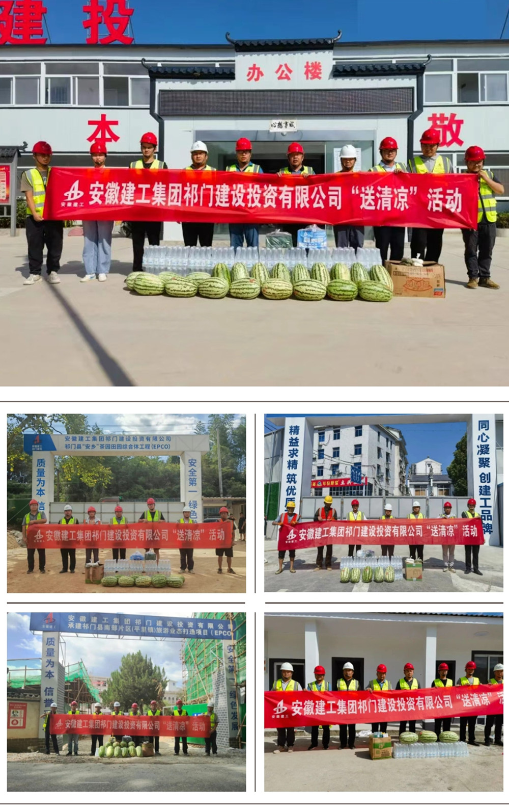 在F012塔坊至平里公路改建工程項(xiàng)目、“安鄉(xiāng)”茶園田園綜合體工程項(xiàng)目、南部片區(qū)(平里鎮(zhèn))旅游業(yè)態(tài)打造項(xiàng)目、祁門經(jīng)濟(jì)開發(fā)區(qū)低碳科創(chuàng)園基礎(chǔ)設(shè)施項(xiàng)目、電商物流產(chǎn)業(yè)園項(xiàng)目、梅城大廈建設(shè)工程項(xiàng)目的施工現(xiàn)場祁門建投領(lǐng)導(dǎo)班子為一線工作人員送去綠豆、人丹、十滴水、西瓜、礦泉水等防暑降溫物品,對高溫下堅(jiān)守一線的員工表示誠摯的慰問和衷心的感謝,叮囑大家要注意休息,提高自我保護(hù)意識(shí)。同時(shí),要求項(xiàng)目管理團(tuán)隊(duì)要認(rèn)真落實(shí)好防暑降溫各項(xiàng)措施,備足備齊防暑降溫物資,守牢安全生產(chǎn)底線,合理安排工作時(shí)間,采取減少高溫時(shí)段室外作業(yè)、輪換作業(yè)、減輕勞動(dòng)強(qiáng)度等措施,把防暑降溫工作落到實(shí)處,確保一線員工的身體健康和施工生產(chǎn)安全有序推進(jìn)。