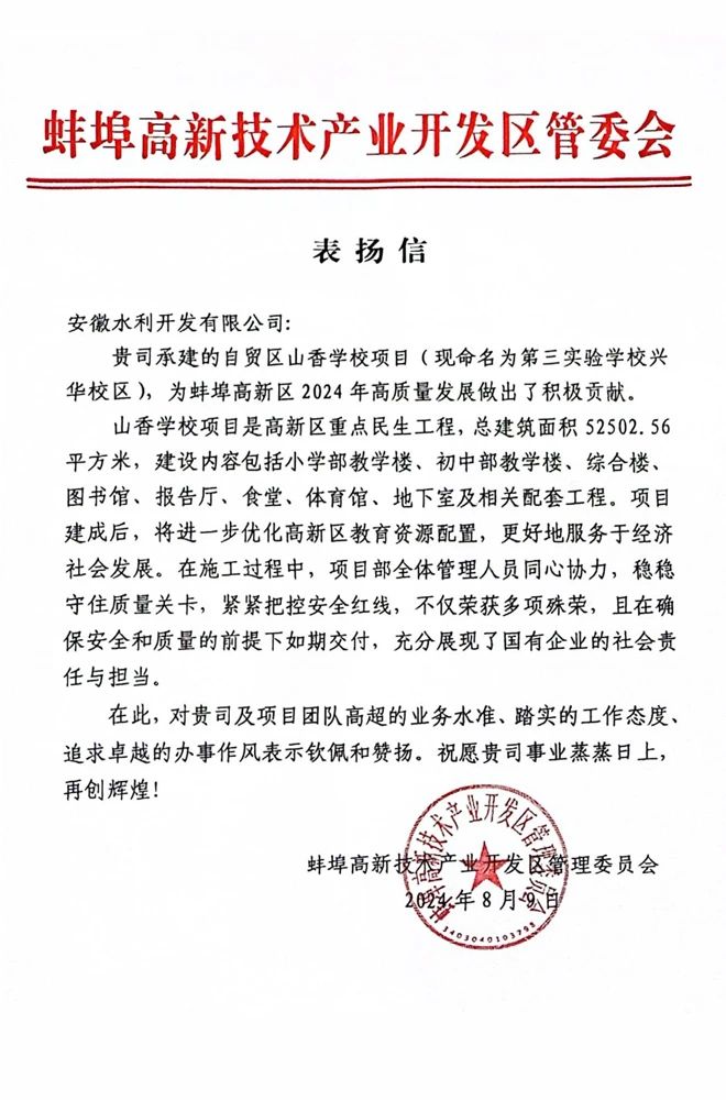 近日,安徽水利山香學校項目獲蚌埠高新區管委會來信表揚,對項目團隊在建設過程中付出的努力和取得的成績給予高度評價。