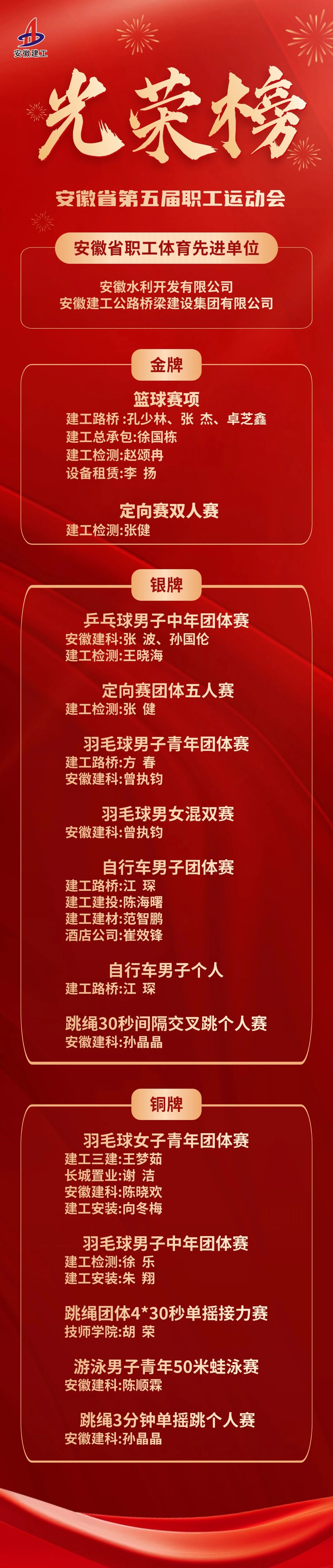 在剛剛閉幕的安徽省第五屆職工運(yùn)動會上,安徽建工選派81名選手參加了籃球、工間操、中國象棋、定向賽等12項(xiàng)體育賽事,并承辦全省住建系統(tǒng)3個賽項(xiàng)的參賽組織工作。在激烈的角逐中,建工健兒奮勇爭先、捷報(bào)頻傳,74名選手榜上有名,斬獲2金7銀5銅良好佳績,安徽水利、建工路橋獲評安徽省職工體育先進(jìn)單位,綜合成績處于全省第一方陣。