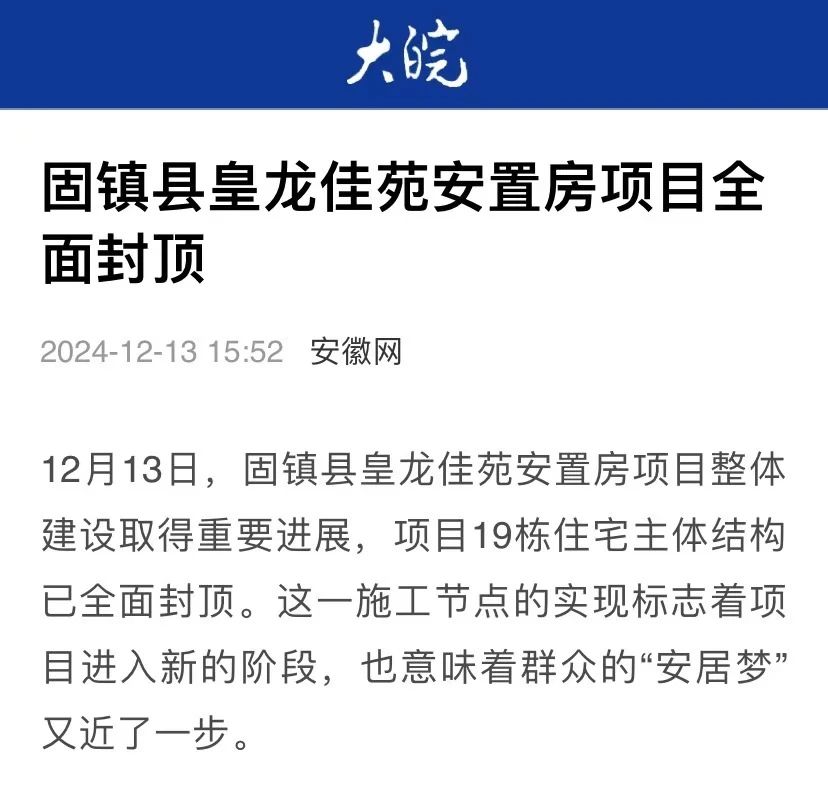 12月13日,安徽水利固鎮縣皇龍佳苑安置房項目全面封頂,受到大皖新聞等媒體關注報道。