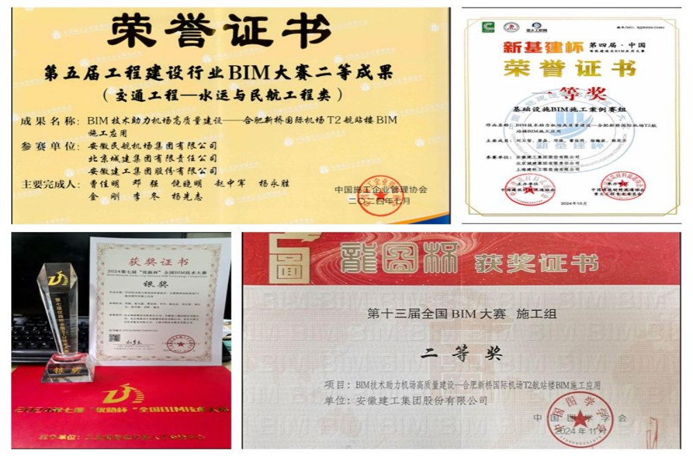 創新驅動,科技強企。建工總承包高度重視BIM技術的融合應用,自合肥新橋國際機場T2航站樓工程項目啟動以來,通過多專業模型深化設計、BIM+AR技術、研發智慧建造云平臺等舉措解決設計圖紙各專業碰撞,實現BIM模型可視化、質量驗評、計量支付、進度管控和安全管理的全面聯動,為項目建設提質增速提供堅實保障。今年以來,項目先后獲評第五屆工程建設行業BIM大賽二等成果、“新基建杯”BIM大賽一等成果、“龍圖杯”BIM大賽二等成果、第七屆“優路杯”全國BIM技術大賽銀獎5項國家級獎項。