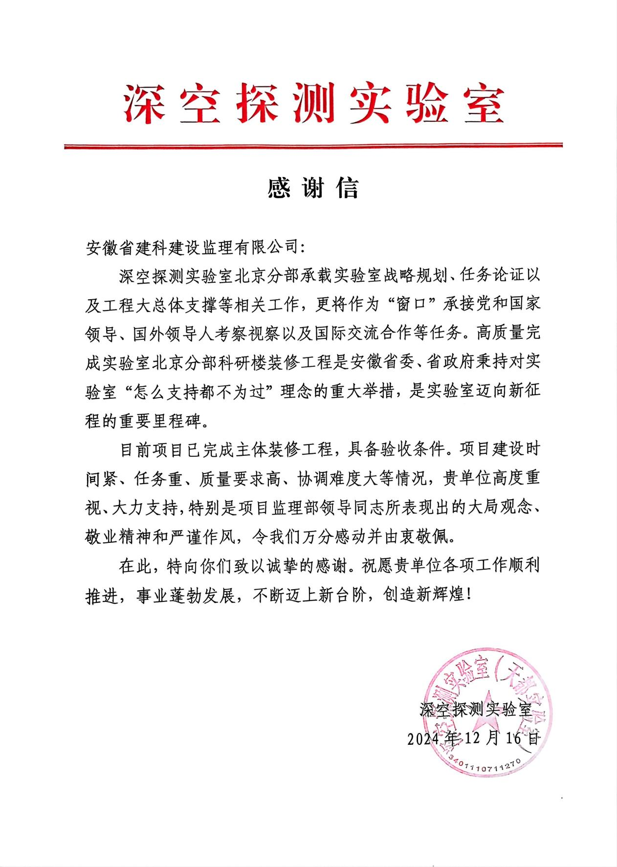 12月16日,深空探測(cè)實(shí)驗(yàn)室向安徽省建科建設(shè)監(jiān)理有限公司發(fā)來(lái)感謝信,對(duì)公司在項(xiàng)目中提供的服務(wù)表示感謝,高度贊揚(yáng)了公司監(jiān)理團(tuán)隊(duì)在北京分部科研樓裝修工程中的卓越表現(xiàn)。