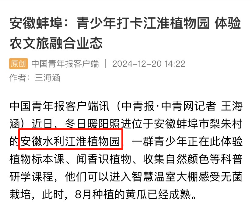 近日,安徽水利江淮植物園著力推動農文旅深度融合,開展豐富的研學旅游等活動,受到中國青年報等主流媒體關注報道。