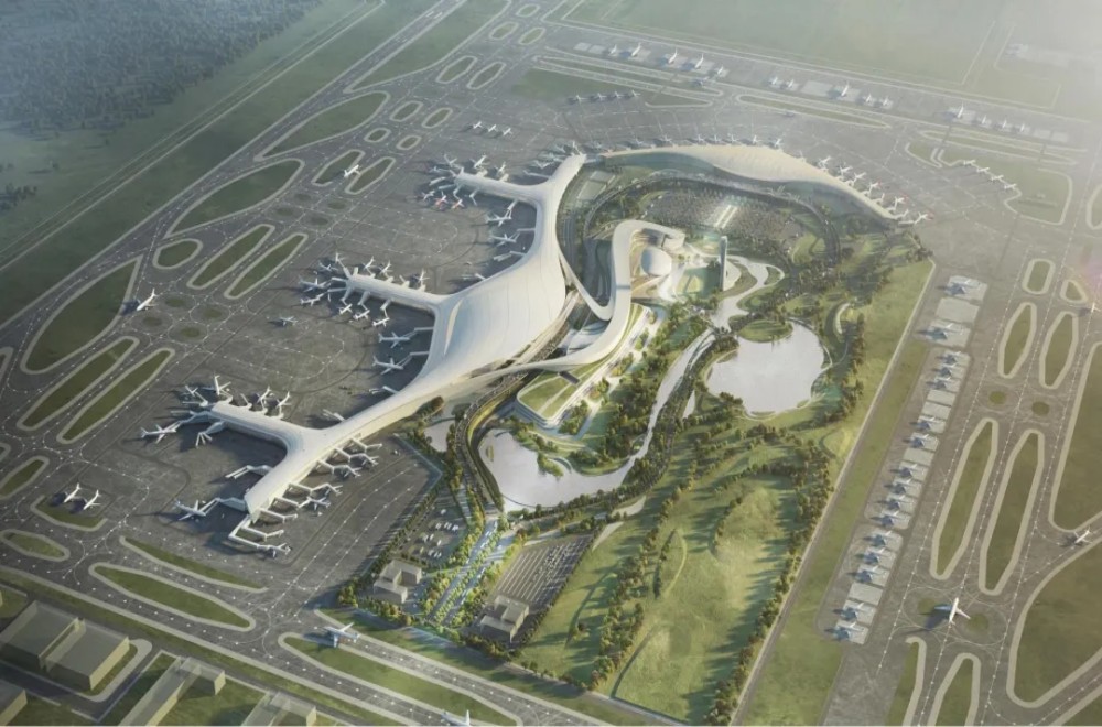 項目總建筑面積約36.98萬平方米,合同工期1097日歷天。采用“雙港灣+雙 L”的建筑構型,主樓面寬約 400 米、進深約 180 米。屋頂標高為 43 米,地下一層、 地上四層,主體結構為鋼筋混凝土框架,屋頂為大跨度空間鋼結構體系。項目建成后,預計可滿足2030年合肥新橋國際機場旅客吞吐量4000萬人次的需求,將為建設“翅膀上的安徽”以及提升合肥區域航空樞紐綜合功能提供堅實支撐。