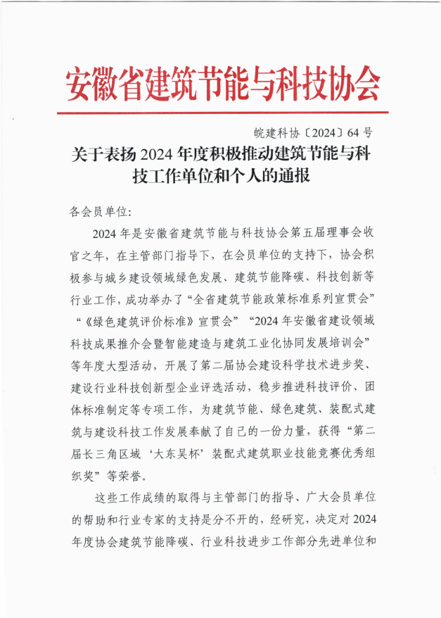 日前,安徽省建筑節能與科技協會發布通報,安徽省(蕪湖)建筑光儲一體化專業委員會被評為先進單位,公司楊海峰被評為先進個人。