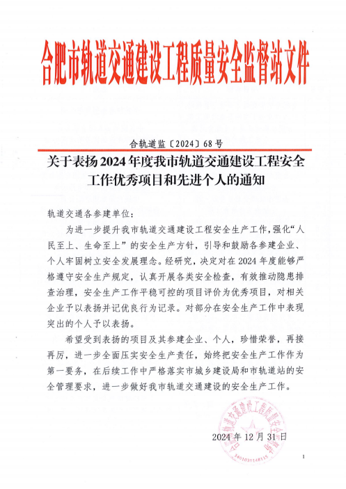 近日,建工路港軌道交通7號線項目榮獲2024年度合肥市軌道交通建設工程“安全工作優秀項目”稱號,項目經理被授予“安全工作先進個人”稱號。