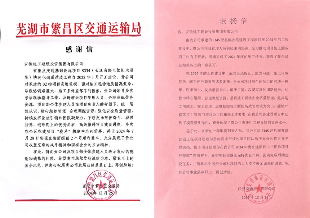 表揚信中指出,S334(長江南路至繁陽大道段)快速化通道改造工程02標項目開工以來,面對施工現場地質情況復雜、導改協調難度大、施工條件差等不利因素,公司領導多次親臨現場指導工作,及時增派項目管理人員、合理調配勞務資源,項目負責人帶領項目部全體參建人員,統一思想認識、精心組織管理,合理調配資源,強化安全質量管理,高效推進項目建設進度,多次在全區在建項目“賽馬”機制中名列前茅,并于2024年7月28日實現主路面提前2個月順利通車,充分體現了我公司攻堅克難的戰斗精神和國有企業的擔當精神;S345涇縣榔蘇路項目在工程建設中,面對征地拆遷、地方問題、施工環境復雜、施工任務繁重等諸多困難,項目部全體員工能夠統一思想、迎難而上,發揚艱苦奮斗、敢于拼搏、攻堅克難的團隊精神,過程中精心組織、合理調配資源,重視施工現場安全質量管理,尤其是文明施工、安全管理、進度把控等方面的高效管理較為突出,能夠嚴格落實主管部門和業主單位的相關工作要求,在業主單位的各建設項目中起到了模范帶頭作用,充分體現了我公司的責任擔當和良好的管理水平。