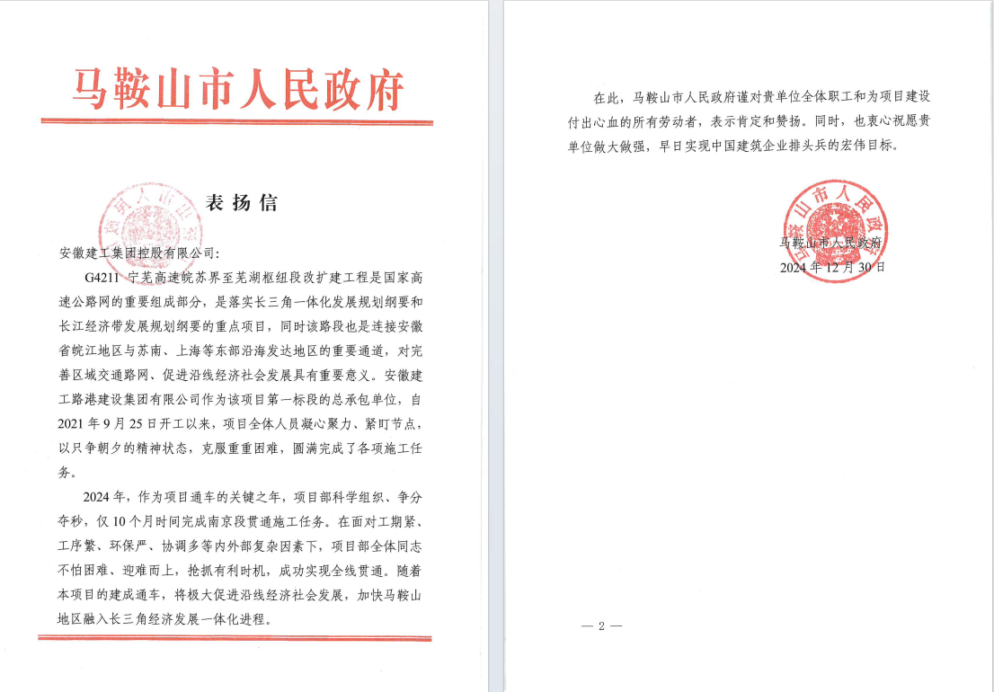 2024年12月30日,項目部收到了來自馬鞍山市人民政府的表揚信,表揚信中對安徽建工集團及安徽建工路港建設集團有限公司全體職工和為項目建設付出心血的所有勞動者表示了肯定和贊揚。這是對項目團隊辛勤付出的最大的肯定,也是對他們專業精神和敬業態度的高度認可。這份表揚信不僅是一份榮譽,更是一種激勵。這份表揚信的背后,是項目團隊無數個日夜的堅守和付出,為當地經濟社會發展做出重要貢獻,也為集團、公司在今后的項目建設中積累了寶貴的經驗,樹立了良好的品牌形象。