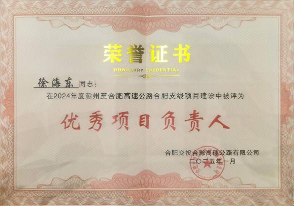 近日,合肥交投合滁高速公路舉辦2024年度總結(jié)大會(huì)暨表彰大會(huì)。滁合支線項(xiàng)目榮獲2024年度“先進(jìn)集體”稱號(hào),徐海東同志榮獲“優(yōu)秀項(xiàng)目負(fù)責(zé)人”稱號(hào),張興強(qiáng)、王盛楠、耿貝貝同志榮獲先進(jìn)個(gè)人稱號(hào)。