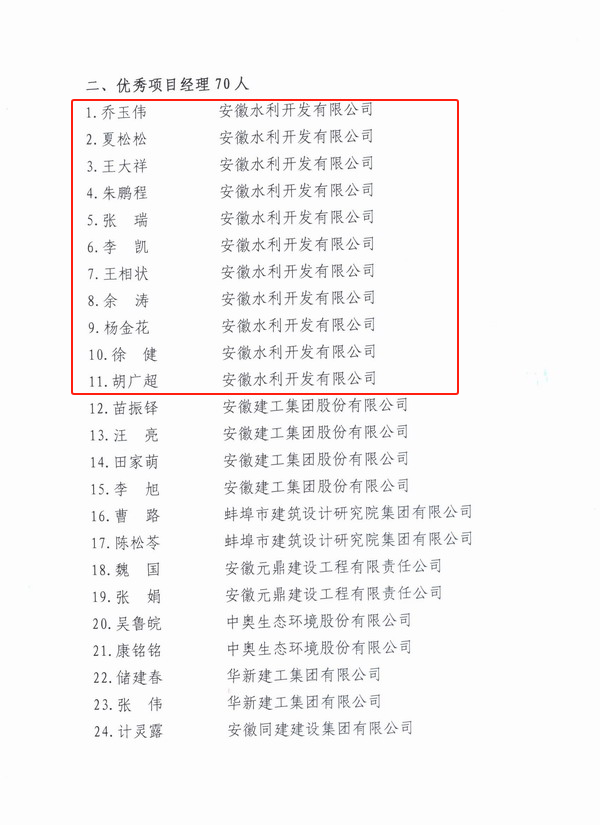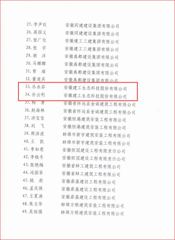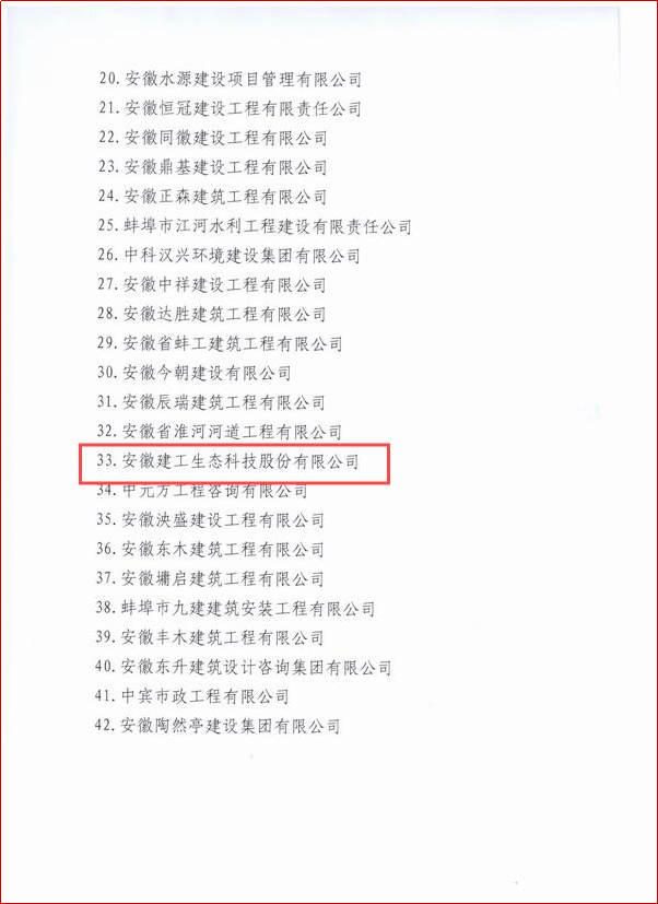 近日,蚌埠市建筑業協會專家評審委員會公布評選結果,安徽水利及所屬安徽建工生態科技股份有限公司獲評2023年度“蚌埠市優秀建筑企業”,安徽水利員工喬玉偉、夏松松、王大祥、朱鵬程、張瑞、李凱、王相狀、余濤、楊金花、徐健、胡廣超、樂永芬、孫云利等13人榮獲“蚌埠市優秀項目經理”稱號。