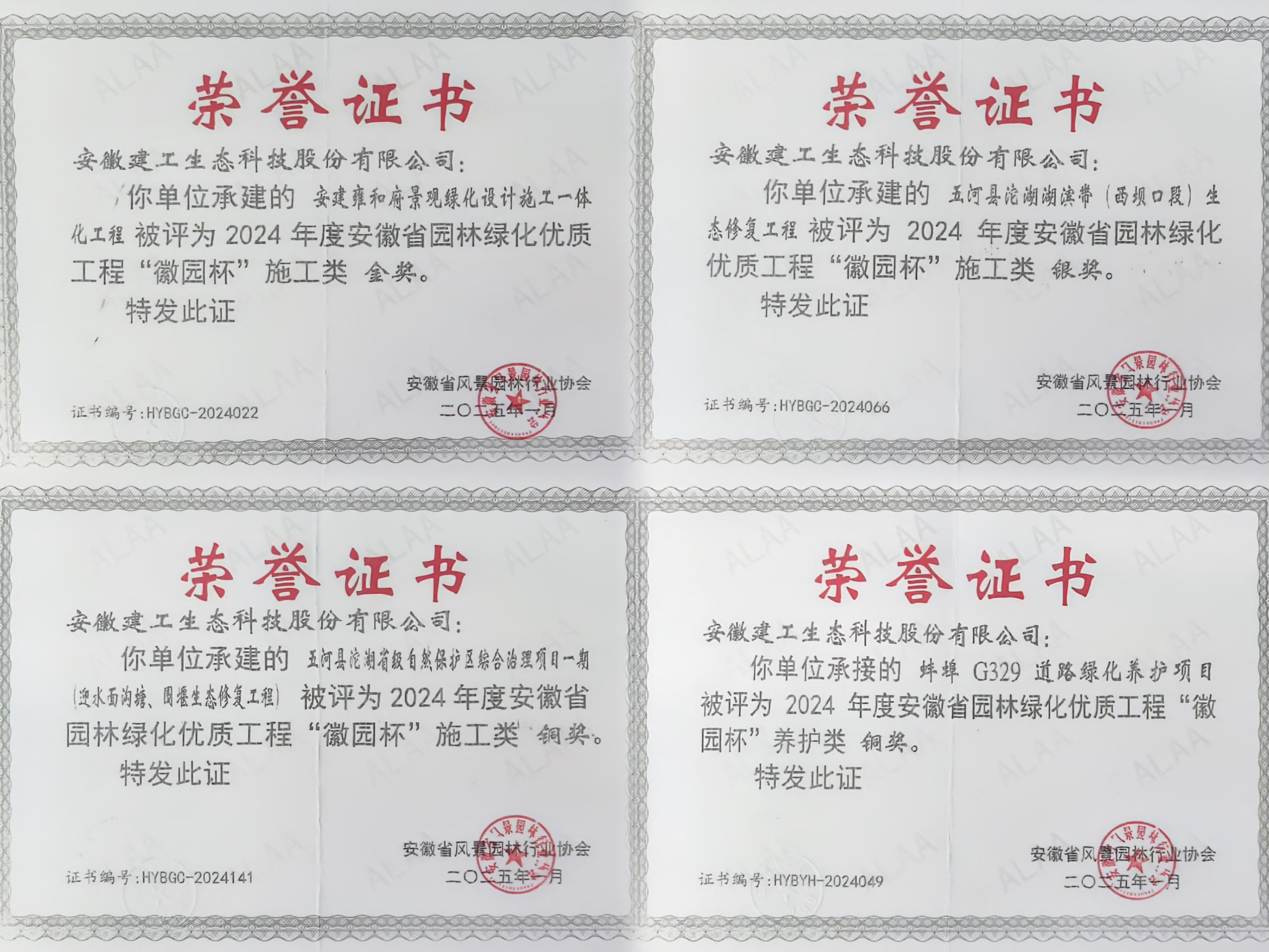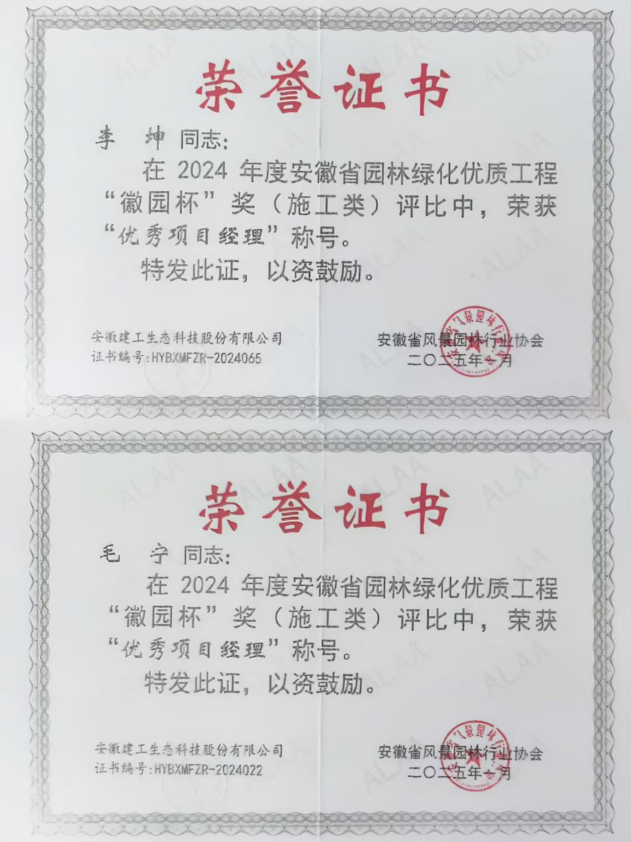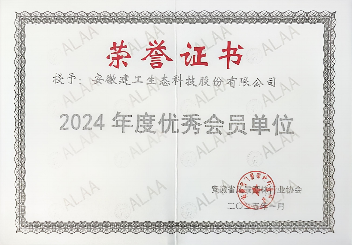其中,生態科技公司榮獲2024年度優秀會員單位;安建雍和府景觀綠化設計施工一體化工程榮獲施工類金獎,五河縣沱湖湖濱帶(西壩口段)生態修復工程榮獲施工類銀獎,五河縣沱湖省級自然保護區綜合治理項目一期(迎水面溝塘、圍堰生態修復)工程榮獲施工類銅獎,蚌埠G329道路綠化養護項目榮獲養護類銅獎;公司員工李坤、毛寧獲“優秀項目經理”榮譽稱號。
