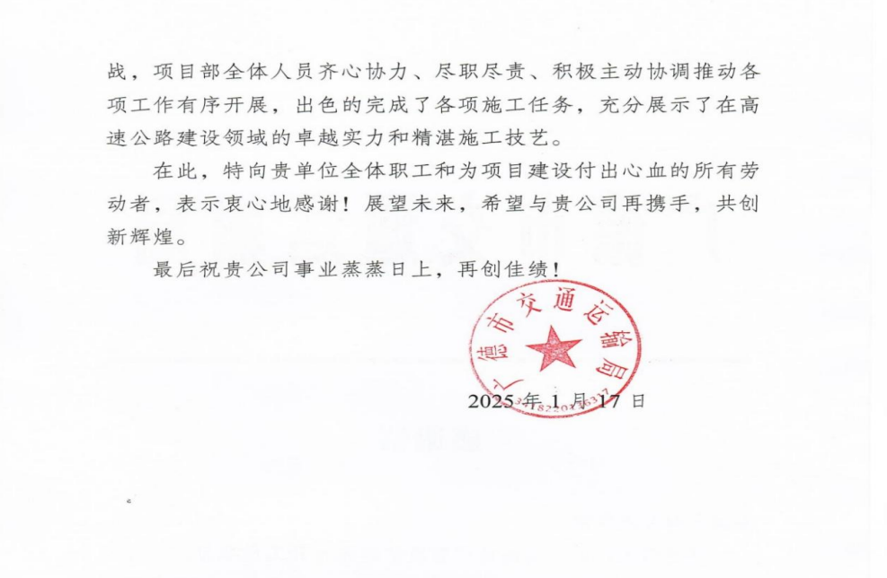 信中指出,自開工以來,項目團隊凝心聚力、緊盯節點,以只爭朝夕的精神狀態,克服重重困難,在合同工期內完成各項建設任務,為高速公路建成通車提供了堅實有力的保障,受到屬地和各參建方的一致好評,充分展示了在高速公路建設領域的卓越實力和精湛施工技藝。