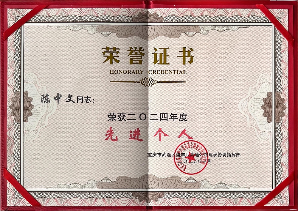 建工建投集團(tuán)重慶墊豐武高速TJ09標(biāo)項(xiàng)目榮獲“2024年度先進(jìn)集體”稱號(hào),陳中文同志榮獲“2024年度先進(jìn)個(gè)人”稱號(hào)。