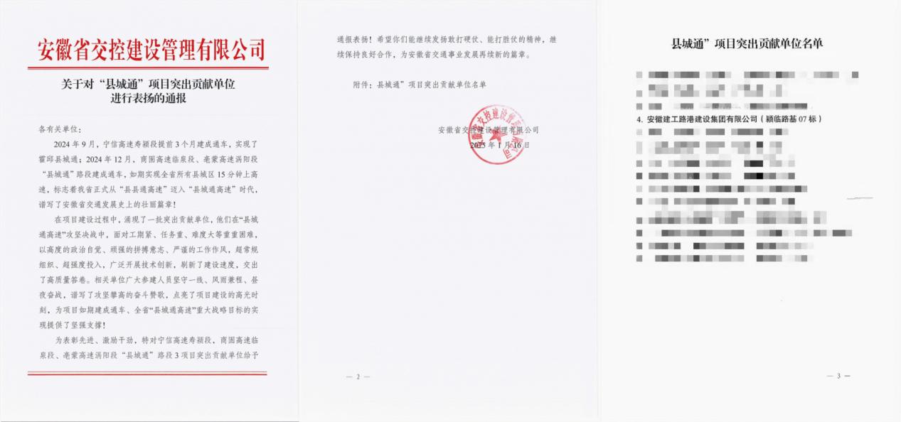 近日,建工路港合周高速潁臨路基07標“縣城通”段項目收到來自業主單位安徽省交控建設管理有限公司的通報表揚。