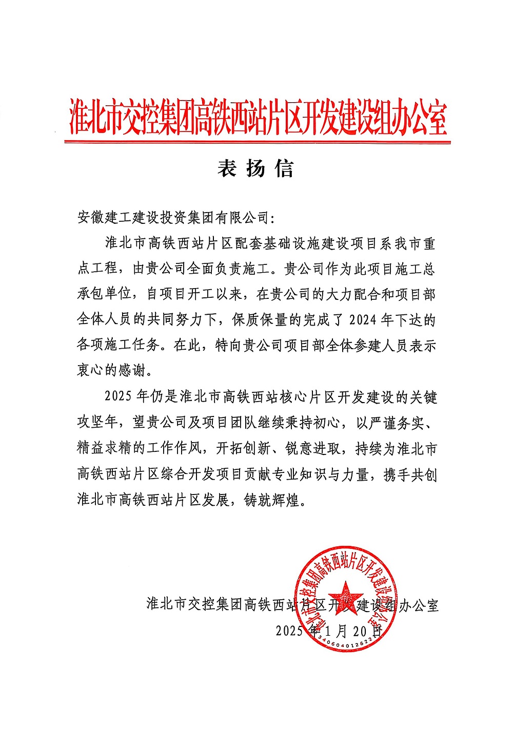 淮北高鐵西站綜合開發項目業主單位淮北市交控集團高鐵西站片區開發建設組辦公室來信表揚:自項目開工以來,在貴公司的大力配合和項目部全體人員的共同努力下,保質保量地完成了2024年下達的各項施工任務。