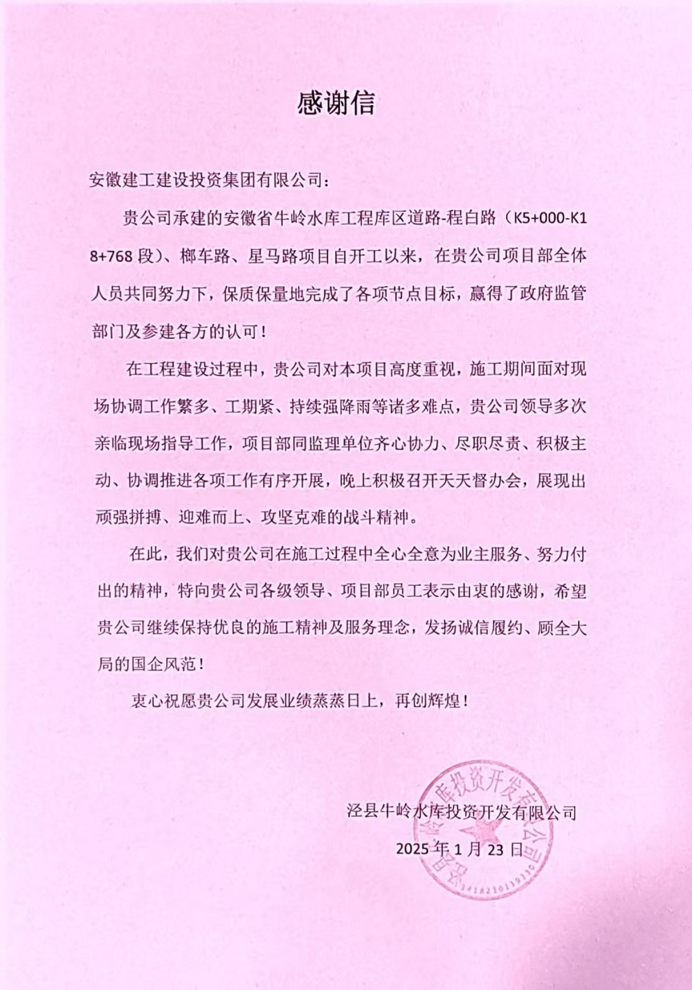 牛嶺水庫工程庫區道路-程白路、榔車路、星馬路項目業主單位牛嶺水庫投資開發有限公司來信表揚:在貴公司項目部全體人員的共同努力下,保質保量地完成了各項節點目標,贏得了政府監管部門及參建各方的認可!在工程建設過程中,貴公司對本項目高度重視,施工期間面對現場協調工作繁多、工期緊、持續強降雨等諸多難點,貴公司領導多次親臨現場指導工作,項目部同監理單位齊心協力、盡職盡責、積極主動、協調推進各項工作有序開展,晚上積極召開天天督辦會,展現出頑強拼搏、迎難而上、攻堅克難的戰斗精神。