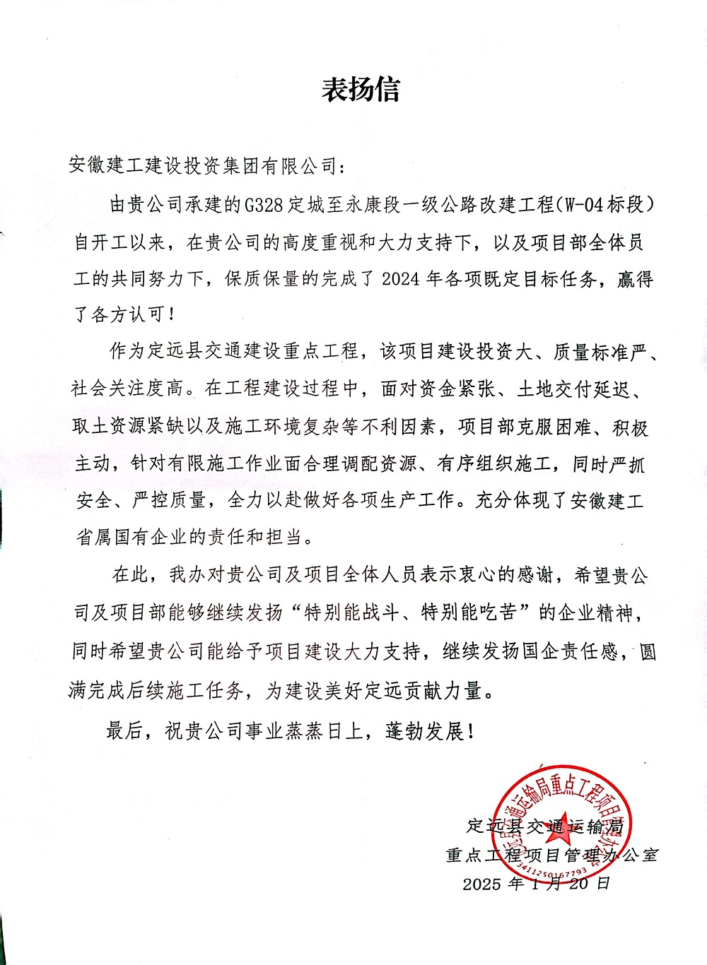 G328定城至永康段一級公路改建工程04標段業主單位定遠縣交通運重點工程項目管理辦公室來信表揚:作為定遠縣交通建設重點工程,該項目建設投資大、質量標準嚴、社會關注度高。在工程建設過程中,面對資金緊張、土地交付延遲、取土資源緊缺以及施工環境復雜等不利因素,項目部克服困難、積極主動,針對有限施工作業面合理調配資源、有序組織施工,同時嚴抓安全、嚴控質量,全力以赴做好各項生產工作。充分體現了安徽建工省屬國有企業的責任和擔當。